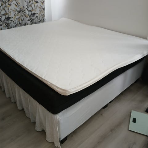 Kaksi tummanruskeaa 80cm x 200cm runkopatjasänkyä ja joustinpatja 160cm x 200cm. Joustinpatjan päällys on vetoketjullinen ja pestävissä. Ei sisällä petauspatjaa.