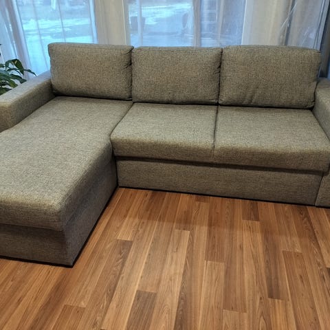 Sohvan pitkä osa 250cm ja lyhyt 180cm. Säilytyslaatikko. Sohvasta saa sängyn ja levitettynä 120x200.