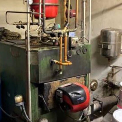 Tästä valmis stokeripaketti, piuha seinään, polttoaineet sisään ja kovaa ajoa. Toimivana käytöstä poistettu, lämmitysjärjestelmän vaihduttua jäi ylimääräiseksi.