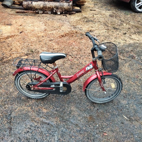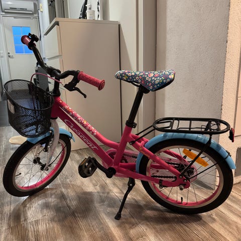 Lasten polkupyörä, jossa 16" renkaat. Rungon ja lokasuojien pääväri on valkoinen, ja pyörässä on vaaleanpunaisia yksityiskohtia. Ketjusuoja on suljettu ja siinä on kukkakuviointi. Pyörässä on jalkajarru, takatavarateline sekä heijastimet polkimissa ja pyörissä. Soveltuu noin 16"-kokoista lastenpyörää tarvitsevalle lapselle arkiajoon ja leikkimiseen.