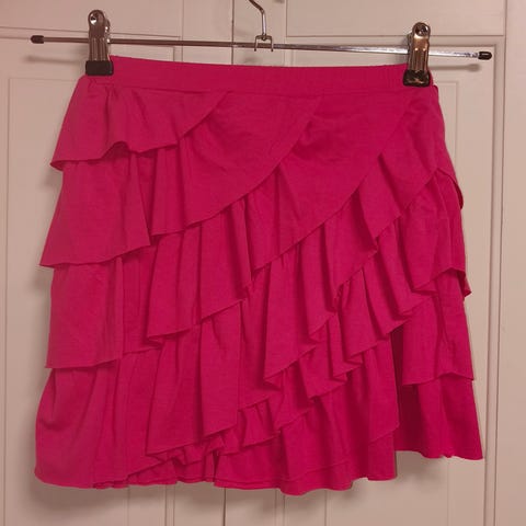 Väri on kirkas pinkki. Edessä on napitus, jossa eriväriset napit, ja vyötäröllä on pieni rusetti. Takana on joustava kuminauhavyötärö. Säädettävä vyötärö. Sivulta on vetoketju.