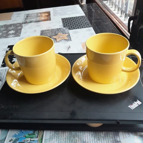 Myydään hyväkuntoinen arabian teema kahvi astiasto 12 kuppia ja aluslautasta.