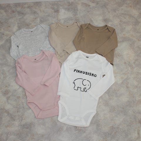 Uusi H&M body, johon käsinpainettu norsu/elefantti kuva ja pikkusisko teksti.