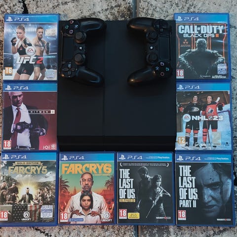 Playstation 4 + 2 ohjainta ja latausteline. Monta vuotta vanha, mutta toimii hyvin ja kaikki osat ehjiä. Mukana myös HDMI-johto, virtajohto ja ohjainten latausjohto. Vain haku Turun keskustan alueelta!