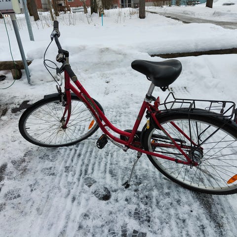 Myydään hyväkuntoinen ja luotettava kaupunkipyörä. Pyörässä on 3 vaihdetta, jotka vaihtuvat sujuvasti ja toimivat moitteettomasti. Myös jarrut ovat hyvässä kunnossa ja pysäyttävät pyörän varmasti. Erityisenä plussana pyörässä on kätevä integroitu runkolukko, johon on tallessa avain. Huomioitavaa: soittokello ei toimi ja eturengas tyhjenee pikkuhiljaa itsestään, joten se saattaa vaatia tarkistusta, paikkausta tai uuden sisäkumin. Muuten tästä saa oikein toimivan pelin ajoon pienellä vaivalla. Satulassa on pieni halkeama, joka on paikattu liimalla — kyseessä on vain esteettinen haitta, joka ei vaikuta käyttöön
