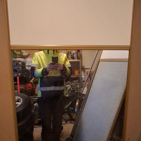 Kuvan kaapin saa hakea joka tarvii pienen liukukaapiston, tanko ja hyllyt on.Peilit kiinnitettävissä.