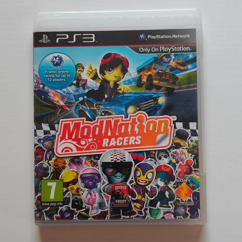 ModNation Racers Playstation 3 peli. "Kilpailupeli, jossa pelaaja voi ajaa erilaisilla autoilla ja hahmoilla sekä luoda omia ratoja ja sisältöä. Ikäraja PEGI 7. Julkaistu Blu-ray-levyllä PS3-konsolille. Sopii yhdelle tai useammalle pelaajalle paikallisesti ja verkon kautta Playstation Network -palvelun kautta, jos palvelu on saatavilla."