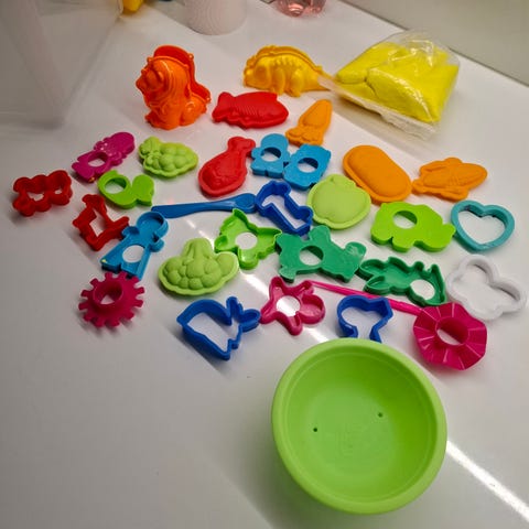 Useita erivärisiä muovisia muottilevyjä, joissa on aakkoset isoilla ja pienillä kirjaimilla sekä erilaisia kuvioita, kuten geometrisia muotoja, kulkuneuvoja, eläimiä ja kasveja. Muotteja voi käyttää esimerkiksi piirtämiseen ja askarteluun paperin tai muun alustan päällä. Muovi on kovaa ja pestävää materiaalia, joka sopii toistuvaan käyttöön lasten piirustus- ja leikkituokioissa.