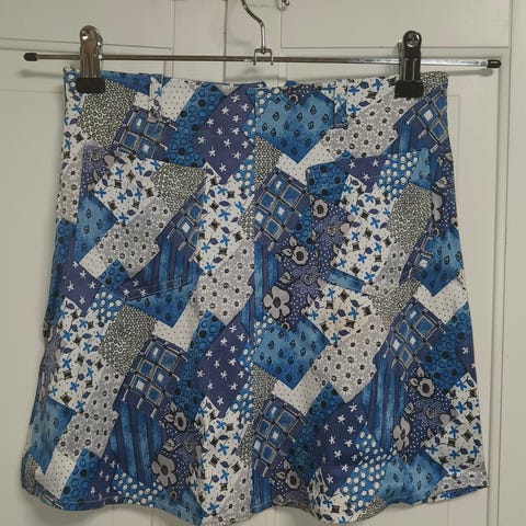 Vyötäröllä leveä, ommeltu vyötärökaitale ja takana joustava osa istuvuuden parantamiseksi. Helmassa ja vyötäröllä koristenappeja ja pieniä rypytyksiä, jotka antavat hameelle kellomaisen muodon.