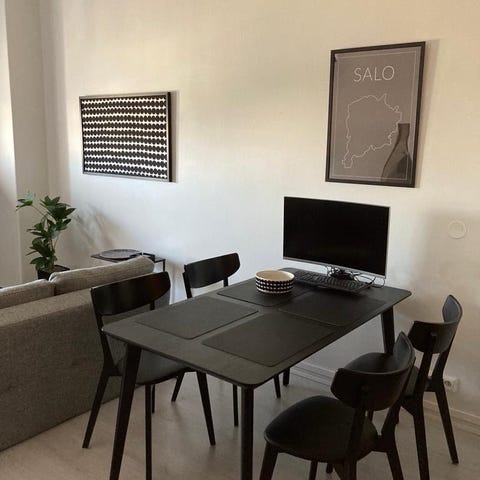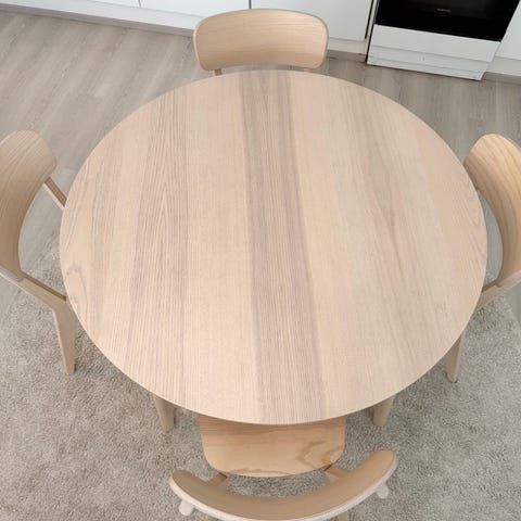 Pöytä hyvässä kunnossa , tuolit ehjät istumiseen . Pinnat ovat kuluneet , maalaamalla saa vielä loistavat tuolit. Nämä tuolit ovat vanhempaa Ikean mallistoa .