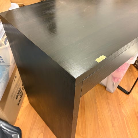 Pöydän päällä näkyy hieman jälkiä ja yksi jalka jumiutunut kiinni, muuten aivan toimiva pöytä.