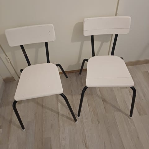 Myydään täyspuiset lasten tuolit 2kpl. Runko valkoinen ja istuinosa puunvärinen. Tuoleissa on käytönjälkiä mutta ne ovat tukevat. Toimivat tuollaisenaan mutta sopivat myös entisöitäviksi. Homeettomasta, eläimettömästä ja savuttomasta kodista. Vain nouto. Ensimmäiselle noutajalle.