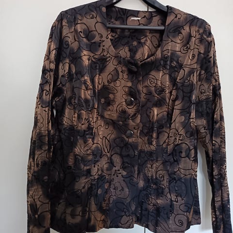 Naisten pukutehtaan kullanvärinen ohut jakku, koko ehkä noin 44. Lappu leikattu
