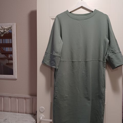 Villasekoitus mekko tumman vihreä. Yksi pieni nirhauma mistä on lähikuva. Muuten kunto hyvä. Koko reilu M / L. Merkkiä ei lue eikä kokoa.