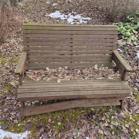 Ostetaan kuvan kaltainen puutarhapenkkki, istuin osa ruskea tai valkoinen.
