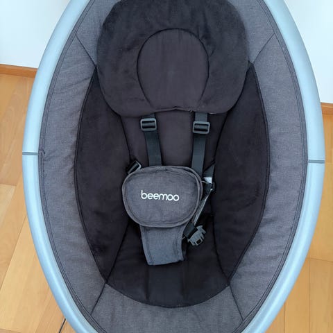 Jollyroom Beemoo sitteri keinuva vauvalle, väri beige. Sitterissä on pehmustettu istuinosa ja turvavaljaat. Runko on metallinen ja sivuilla on ohjauspaneelit, joista voi säätää keinutoimintoja ja erilaisia ääniä toimintoja (musiikkia, lintujen ääniä yms). Kaarella on pehmeitä ripustettavia leluja vauvan katseltavaksi ja kosketeltavaksi. Sopii pienen lapsen lepo- ja leikkihetkiin sisäkäyttöön.
