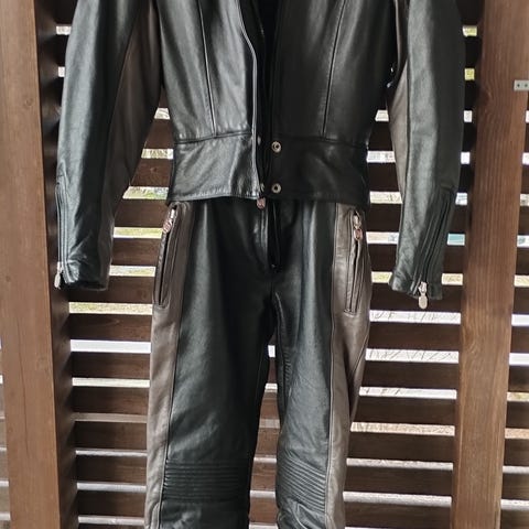 Kaksiosainen nahkainen ajopuku, johon kuuluu musta/punainen ajotakki ja mustat ajohousut. Takissa on etuvetoketju ja painonappikiinnitys sekä toppauksella varustettu sisävuori. Housuissa on vetoketjukiinnitys ja vahvistetut polvialueet. Sopii esimerkiksi moottoripyörä- tai muun ajoharrastuksen suojavarusteeksi.