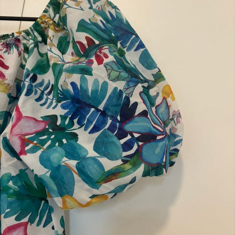 Pusero, monivärinen kukkakuosi. V‑pääntie ja lyhyet hihat, vuori. My Wear.