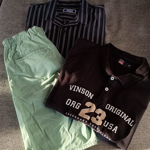 Myydään pakettina t-paidat 4kpl ja shortsit 2kpl. Koot 164 ja 170, vihreä paita S kokoa. Käytetty hyvä kunto, vihreä Timberland paita uusi.