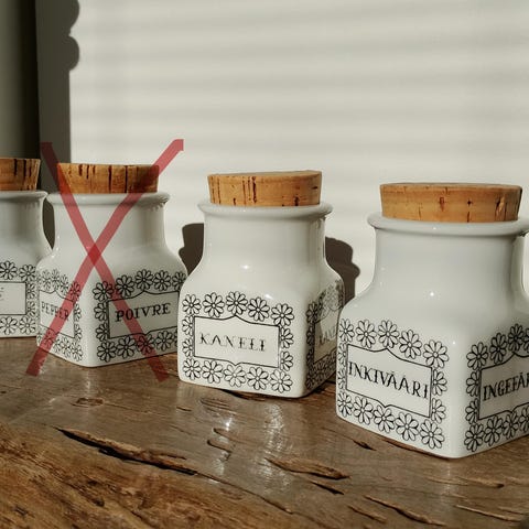 Valkosipulisuola, Maustepippuri, Curry ja Oregano. Purkeissa teksti myös ruotsiksi.