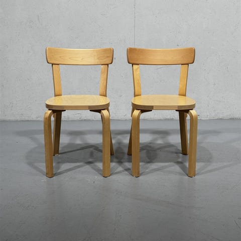 Kolme Alvar Aallon suunnittelemaa 69 mallin tuolia, valmistettu vuonna 2006. Tuolit ovat Artek-merkkisiä ja niissä on selkeä, ajaton muotoilu.