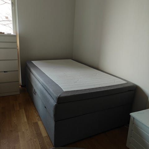 Finsoffan erinomaisessa kunnossa oleva jenkkisänky. Kangas tummanharmaa. Runko on kaksiosainen, mikä helpottaa kuljetusta. Leveys 120 cm, pituus 210 cm, korkeus (maasta) 54 cm, jalat 10 cm. Vain nouto.