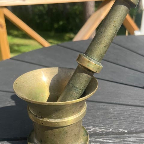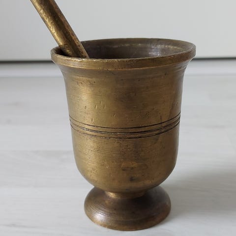 Painava messinkinen mortteli ( korkeus 9 cm) ja survin( pituus 18 cm).