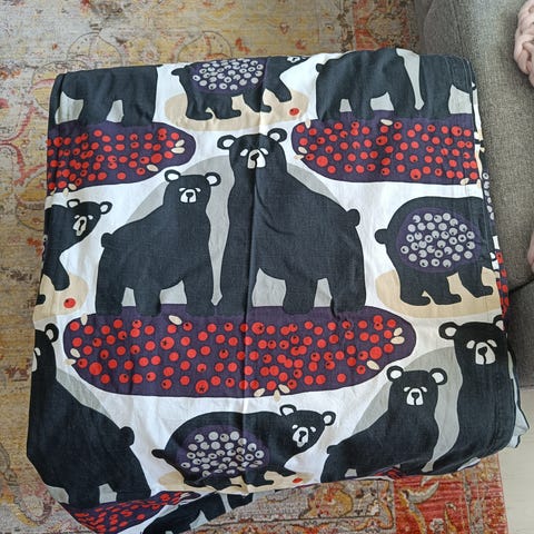 Hellyyttävä karhukuvio toistuu kankaassa koko kankaan pituudelta samanlaisena. Kangas on pesty ennen myyntiin laittoa. Huom, eläintalous.