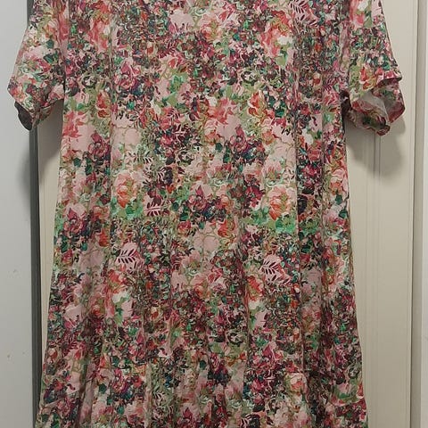 Kokomerkintä XL. Sivussa piilovetoketju ja nappi, vyötärö joustaa kuminauhan ansiosta (vyötärömitta venyttämättä 41 cm ja venytettynä noin 53 cm). Hameen pituus vyötäröltä helmaan noin 78 cm. Materiaali lyocellia.