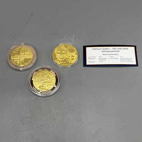 Kaksi kultaista juhlarahaa, joissa on Suomen leijona ja teksti '100 vuotta itsenäinen Suomi'. Kolikoissa on koristeellisia yksityiskohtia ja ne ovat suojakotelossa.