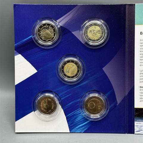 Kolikot edustavat modernia suomalaista juhlarahamuotoilua, joka korostaa kansallista symboliikkaa ja itsenäisyyden merkitystä.