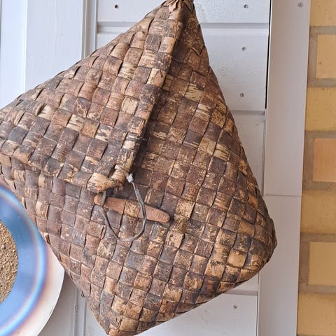 Suomessa käsityönä valmistettu reilun kokoinen tuohikontti. Korkeus 42 cm, leveys 40 cm, syvyys 18 cm. Ehjä ja hyväkuntoinen. Peräisin ehkä 1950 -60 luvulta.