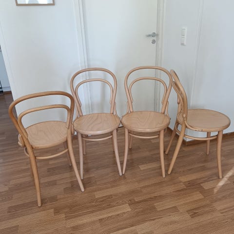 Myydään valkoisia Ton14 tuoleja 2kpl. Ostettu uutena vuonna 2020. Pientä käytön jälkeä, mutta yleisilmeeltään erittäin siistit. 2kpl tuoleja yht. 350e.