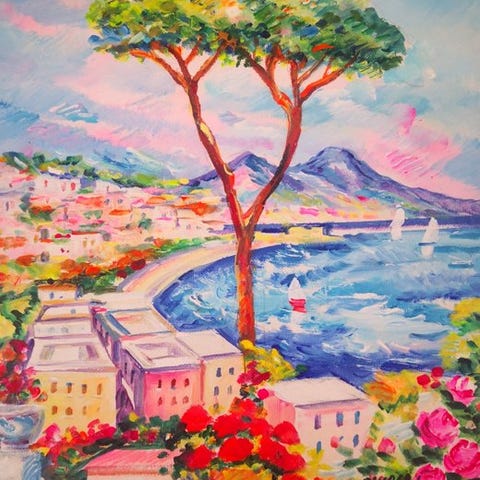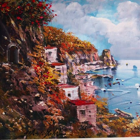 Öljyv taulu kankaalle 20 x 40, mestari Mariano Galanti, joka esittää kalastajia työn touhussa auringonlaskussa Sorrentossa Amalfin rannikolla. Näkyy mestarin erinomainen maalaustaito, joka on aina erikoistunut tuomaan teoksiinsa Napolinlahden saarten ja Amalfin rannikon auringonlaskuja käyttäen lämpimiä ja eloisia värejä, mikä tekee teoksesta harmonisen ja elegantin. Takakannassa taiteilijan signeeraus. Lähtö: yksityiskokoelma ja seurattava toimitus.