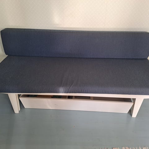 Sotkasta 2020 ostettu Malmö-kankainen sohva. Sohvan saisi levitettyä sängyksi, mutta rungosta katkennut palanen joka pitää laatikon paikoillaan, näppärä saa varmasti korjattua. Divaaniosuuden alla säilytystilaa.