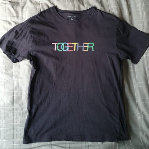Värikkään kollarin valmiiksi haalistettu kuvitus vie ajatukset kaukomaille. Materiaali luomupuuvillaa, takapituus 70 cm ja kainalomitta 58 cm.