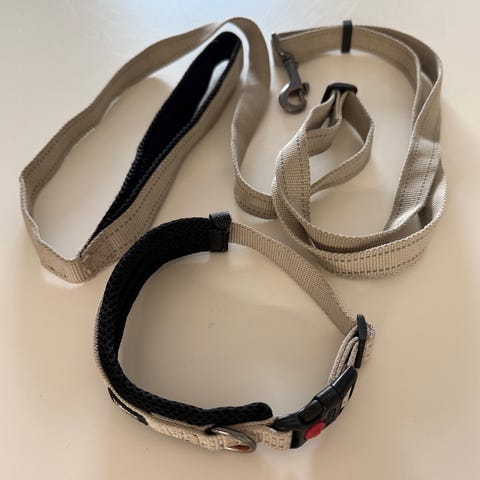 Rukan koiran hihna, pituus n. 210cm, leveys 2,5cm säädettävä, kuin uusi ja panta 34-42cm, leveys 2,5cm, turvalukolla ja säädettävä, hieman kulunut ja haalistunut. Hinta yhteensä 6€