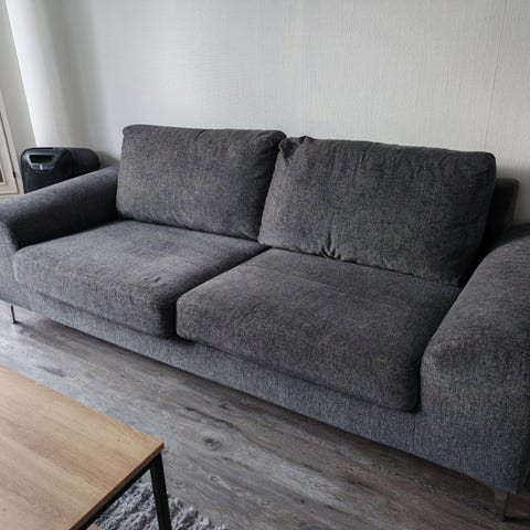 Tummanharmaa divaanisohva. Divaanin kätisyys vaihdettavissa. Käytön jälkiä, mutta ehjä! Istuintyynyyn kaatunut joskus kynsilakkaa, tahra näkyy kuvissa. Divaanin syvyys noin 152cm.