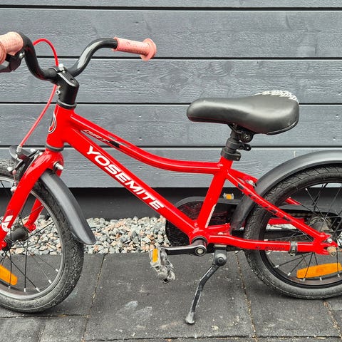 Jupiter lastenpyörä 16". Pyörässä on 16 tuuman renkaat, jalkajarru takana ja käsijarru edessä. Rungon väri on sininen ja lokasuojat ovat mustat. Satula ja ohjaustanko ovat säädettävissä lapsen pituuden mukaan. Kevyt runkoinen. Ostettu uutena.
