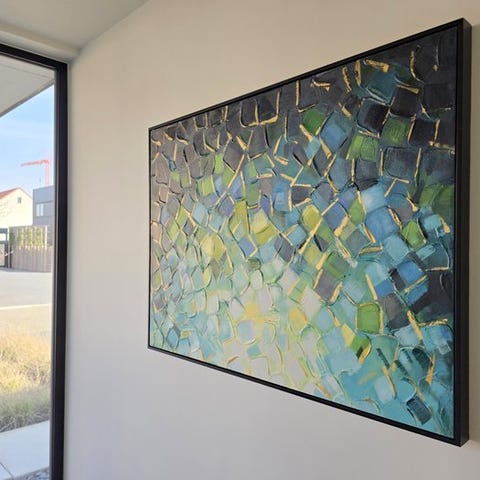 Upea ja värikäs taideteos. Abstrakti ja modernisti muotoiltu kanvas kehystettynä.Korkeus 90 cmLeveys 120 cm