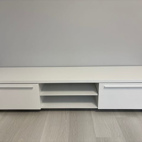 Valkoinen tv-taso, ovet korkeakiiltoiset. Lev 183, kork 27 ja syv 51 cm. Kaapissa lasiset hyllyt. Laatikossa lokerot. Muistaakseni ostettu Askosta. Kunto on oikein hyvä, muutama aivan pieni kolhu näkyy tarkasti läheltä katsottaessa (kuvat). Painava. Savuton ja homeeton koti. Meillä on kissoja. Nouto Nummelasta.
