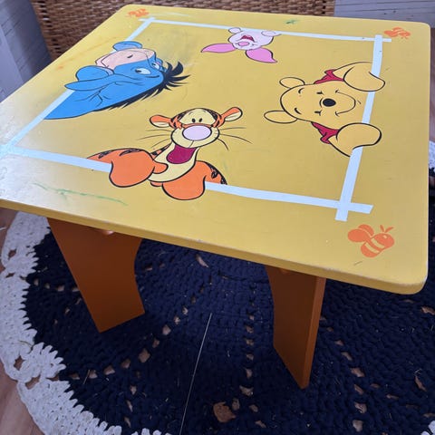 Lasten puinen pöytä ja kaksi jakkaraa Nalle Puh -kuvioilla
