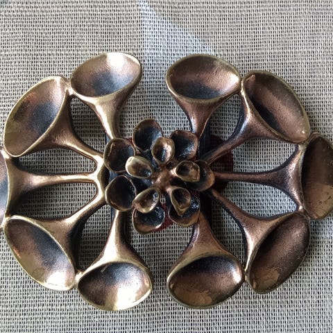 Ovaalinmuotoinen metallinen vintage vyönsolki, jossa kohokuvioitu skorpioni ja koristeellinen taustakuvio. Väri on tumma, lähes musta. Soljen leveys on noin 8–9 cm (mitattu kuvassa näkyvän mittanauhan perusteella). Takana on metallinen kiinnityslenkki ja nasta vyön reikää varten. Valmistusmerkintänä "Made in U.S.A." sekä valettuja tunnuksia ja numeroita. Sopii käytettäväksi vyön kanssa tai esimerkiksi keräilyesineenä.