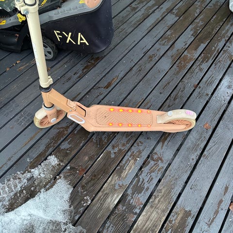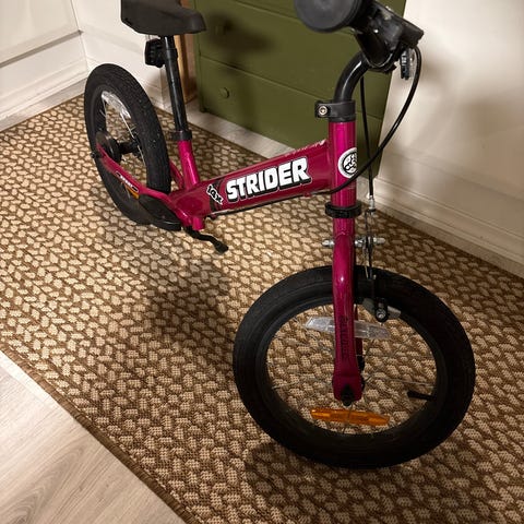 Lasten potkupyörä, jossa 10" renkaat. Rungon väri on pinkki ja satula sekä ohjaustangon kahvat ovat mustat. Pyörässä on matala runko ja jalkatuki, joka helpottaa käyttöä pienillä lapsilla. Soveltuu tasapainon harjoitteluun ja liikkumiseen lyhyillä matkoilla.