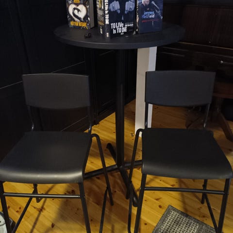 Baarisarja, johon kuuluu suorakulmainen baaripöytä ja neljä baarituolia. Pöydän kansi on valkoinen ja valmistettu MDF-levystä, jalat ovat metallia puukuviopinnoitteella. Pöydän mitat ovat noin 120 x 60 x 105 cm (pituus x leveys x korkeus).