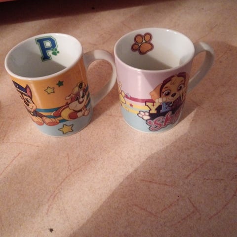 Ryhmä hau astioita. 2 lautasta, kuppia ja mukia.