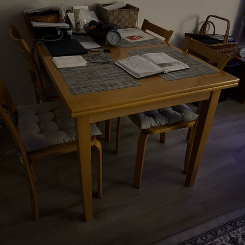 Ruokailuryhmä jatkettava ruokapöytä ja 6 tuolia, sävy kirsikka. Tukevat puiset kangaspäällysteiset tuolit perus siistit, vain yhdessä tuolissa tahra. Istuin kork 45cm s. 42cm ja l.43,5cm