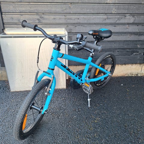 Lasten polkupyörä jonka kunto käytännössä muuten moitteeton paitsi taustalla olevasta lastenistuimesta jäänyt kulumajälkiä remmeistä ja polkimet ja takavanteen mutterien päät kuluneet kun pyöräilyä harjoiteltu alusta alkaen ilman apupyöriä. Loistava pyörä aloittaa keveytensä vuoksi.