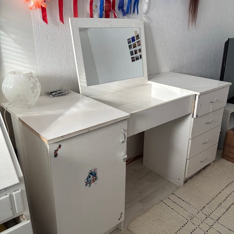 Annetaan pöytä. Ollut tietokonepöytänä ja näytön jalalle on tehty lovi pöytään.