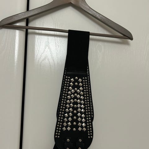 Naisten joustava punainen vyö. Leveä malli, jossa kuminauhamainen materiaali ja edessä muovinen solkikiinnitys niittikoristein. Sopii käytettäväksi esimerkiksi mekkojen ja tunikoiden kanssa vyötäröä korostavana asusteena.